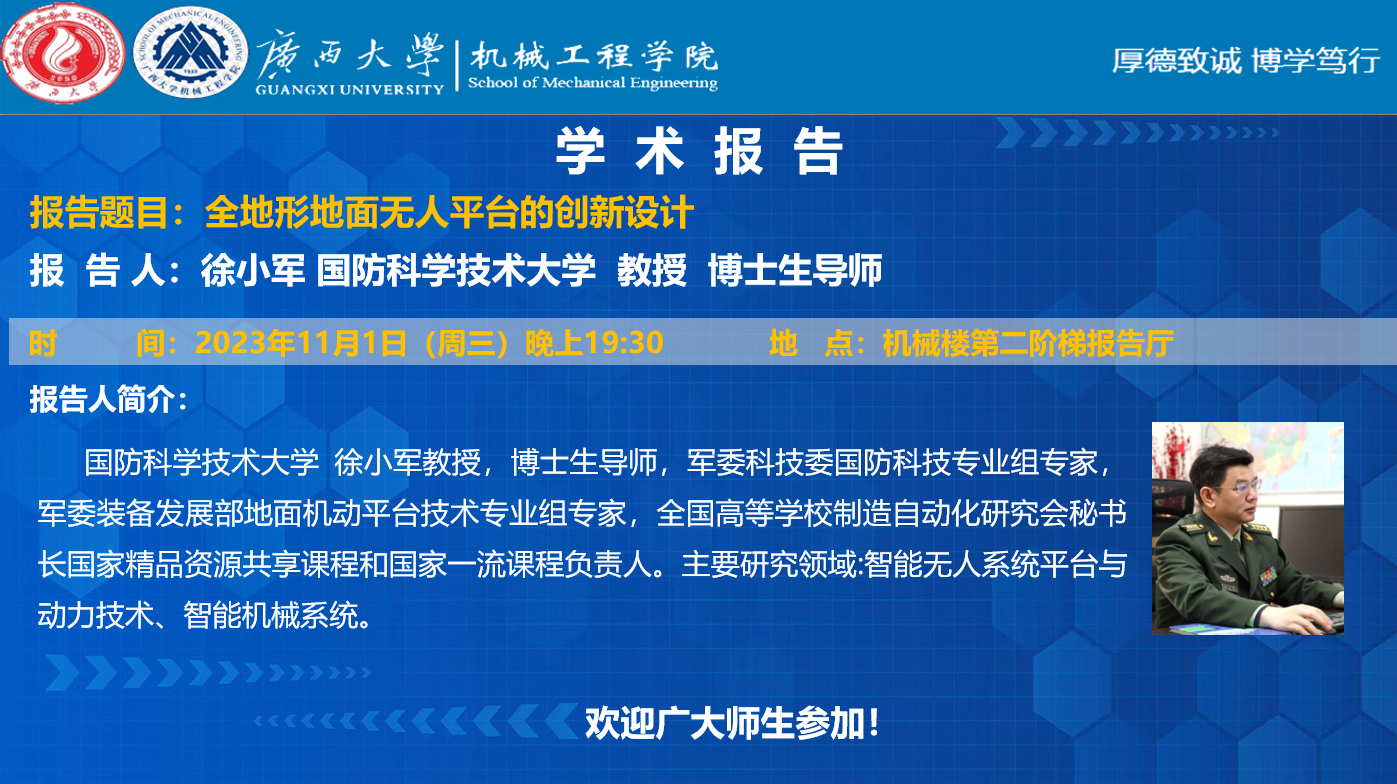 【机械工程学院学术报告】 全地形地面无人平台的创新设计