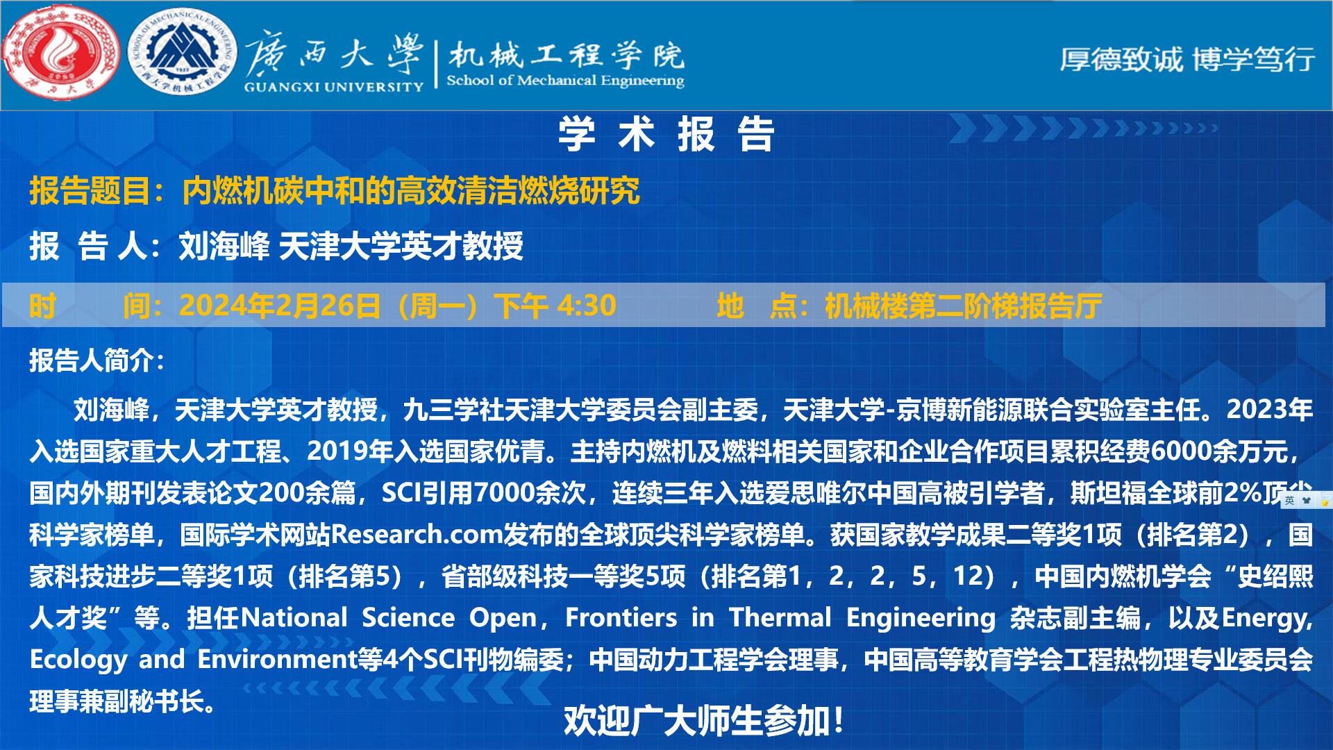 【机械工程学院学术报告】内燃机碳中和的高效清洁燃烧研究