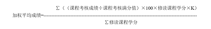 二、学生须按时完成教学培养计划规定的课程。计算加权平均成绩时,按主修专业教学培养计划所修(含教学计划规定应修)各门课程的初修正考成绩计算加权平均成绩(保留至小数点后两位),统计的时间范围为入学至毕业学年之前。加权平均成绩的计算公式为: