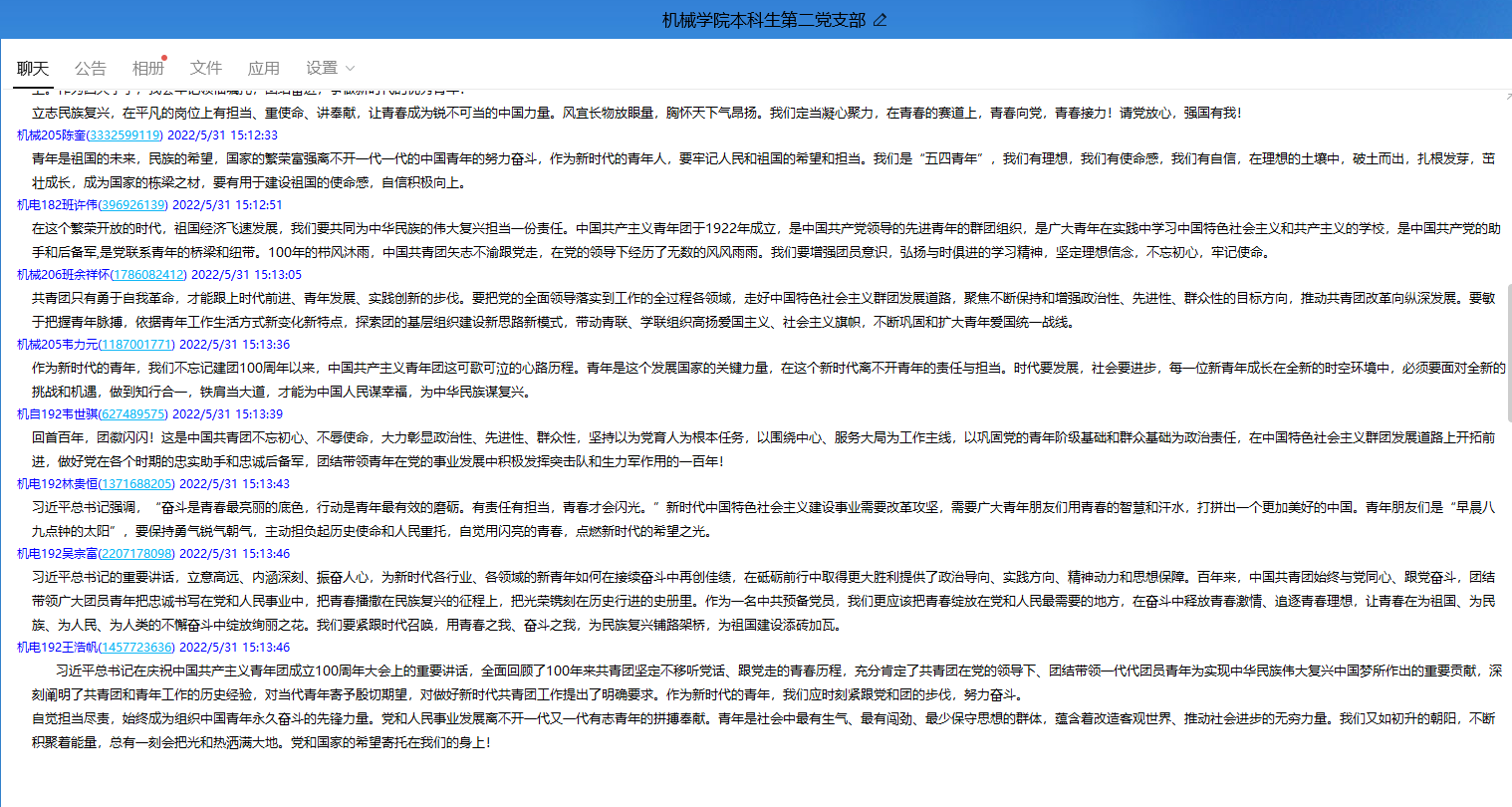 2022年5月10日,庆祝中国共产主义青年团成立100周年大会在北京举行,习近平总书记出席并发表重要讲话。为深入学习贯彻习近平总书记的重要讲话精神,根据学校《关于深入学习贯彻习近平总书记在庆祝中国共产主义青年团成立100周年大会上重要讲话精神的通知》的要求和具体安排,在学院党委的指导下,我院本科生第二党支部于5月31日下午组织召开了专题学习活动。