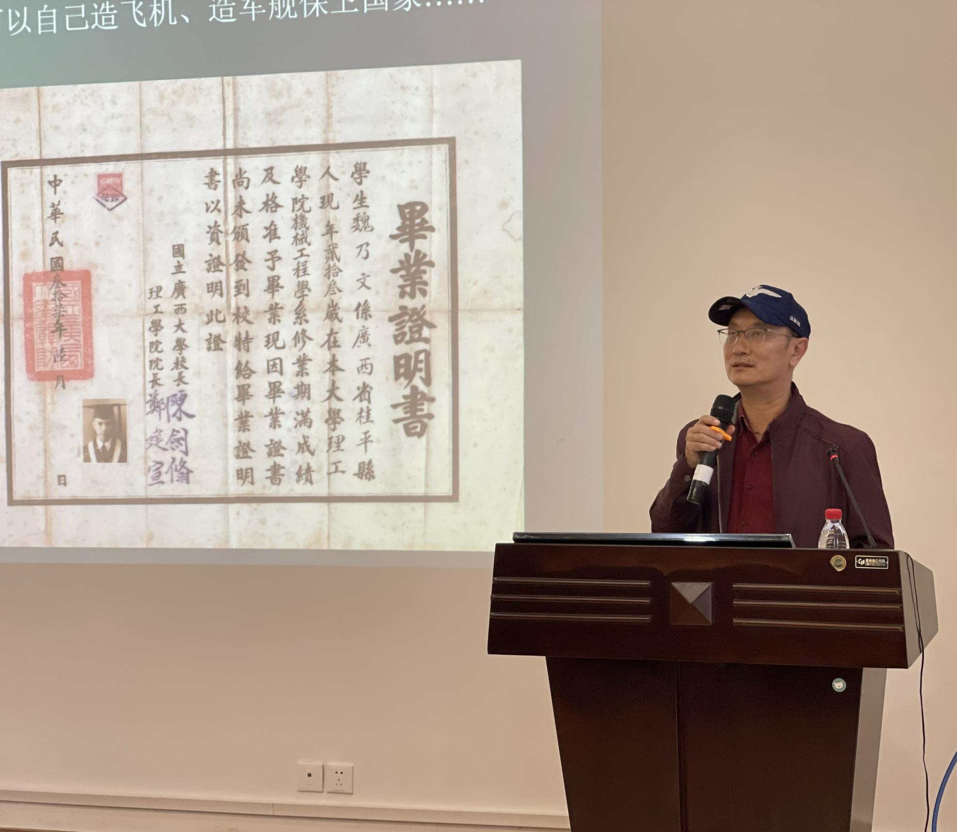 2022年11月15日下午,学院召开了全院教职工课程思政教育大会暨清廉故事会。此次特别邀请我院杰出校友、国家“两弹一星”研究专家魏乃文老先生的侄子——魏风先生,为全院教师职工上了一堂以追忆魏乃文老先生生平事迹、学习魏老家国情怀为主题的思政教育课。