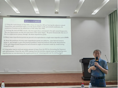 张建成教授分享了其团队在过去数年的科研成果,其主频谱分析、力元理论等原创性方法已成功应用于相关的工程和医学领域。一个个鲜明的应用案例,让师生们感受到力学与数学的关联与魅力。张家欧教授阐述了半球谐振陀螺仪在航空航天领域的应用,分享了其课题组近年来对“石英谐振半球壳进行频差修正以提升半球谐振陀螺仪性能和精度”的研究成果。