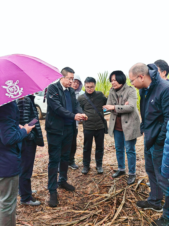 为加快推进亚热带智能农机装备现代产业学院(以下简称“产业学院”)工作部署,促进政校企深度合作,推进“政产学研用推”融合,1月12日上午,学院党委书记卢婵江一行20人赴扶绥开展调研,一同参加的还有自治区农机化服务中心、产业学院共建单位广西农业机械研究院有限公司和惠来宝机械制造有限公司相关负责人。在自治区农机中心鉴定站站长叶长青的带领陪同下,先后深入“甜蜜之光”隆田糖料蔗示范区、区农机中心试验鉴定工作站以及我院农科新城科研用地进行走访调研,了解目前甘蔗收割机等装备应用情况、甘蔗生长情况及种植农艺、品种等。