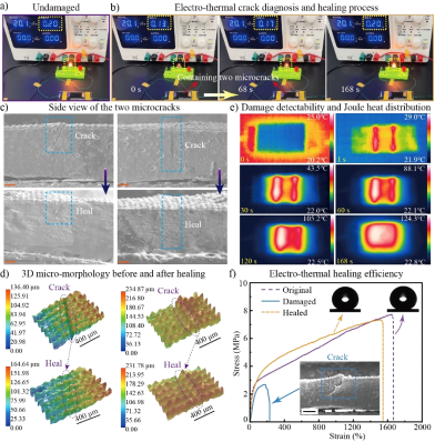 研究中首次提出了基于电热效应的实时损伤检测与修复方法以提升S-TPU-F-CB膜的机械耐久性。该方法利用电热效应,结合红外热成像技术,实现了基于焦耳热动态分布的秒级损伤检测和可视化自修复过程。依据灯泡亮度和电流值变化,分别从定性和定量角度观测到电热修复过程,对比损伤-修复的测试样本,表征其2D和3D微观形貌,发现修复后微裂纹消失,表面仍然保持着微纳米柱阵列结构,同时损伤区域的润湿性从高粘附的Wenzel态恢复为低粘附的Cassie态。