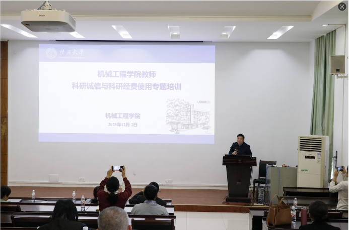 为落实国家关于科研诚信与科研经费管理的工作要求,进一步规范科研行为,提升科研经费使用效能,筑牢学术道德与财经纪律双重防线,机械工程学院于2025年12月2日举办“机械工程学院教师科研诚信与科研经费使用”专题培训。本次培训由分管科研与实验室副院长黄豪中主讲,学院70余名专任教师参加培训。