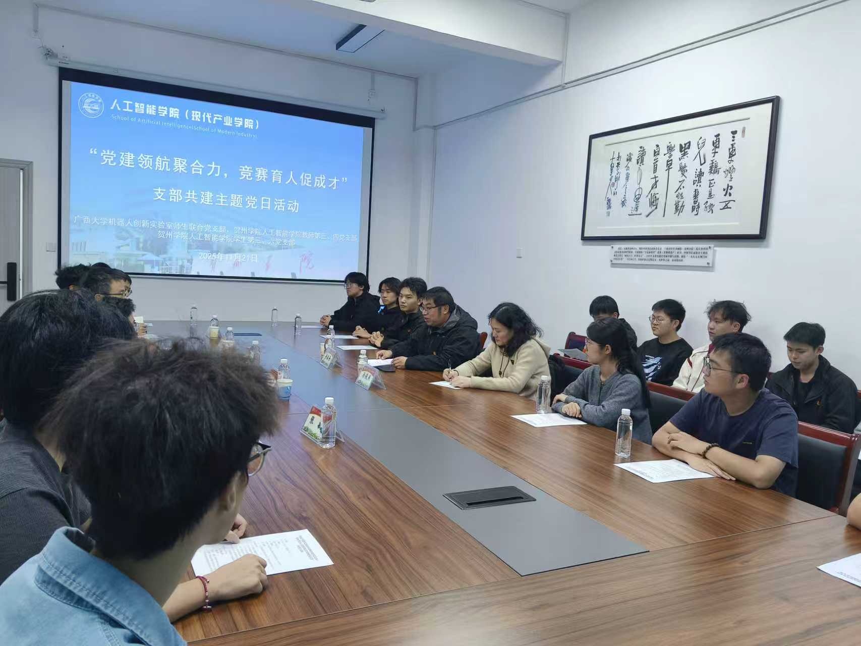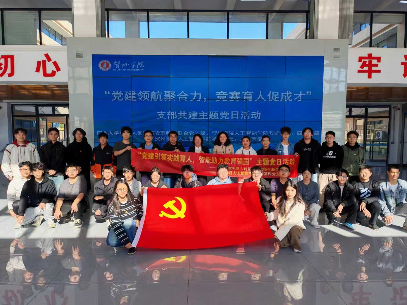 2025年11月21日下午,我院党委新成立的广西大学机器人创新实验室师生联合党支部在支部书记李岩舟老师的带领下,赴贺州学院与贺州学院人工智能学院教师第四党支部开展“党建引领实践育人,智能助力教育强国”联合主题党日活动。贺州学院人工智能学院(现代产业学院)党委书记李素云、党委副书记兼纪委书记邓玉赏、智能工程系主任罗士君以及两个支部的全体党员参加联建。