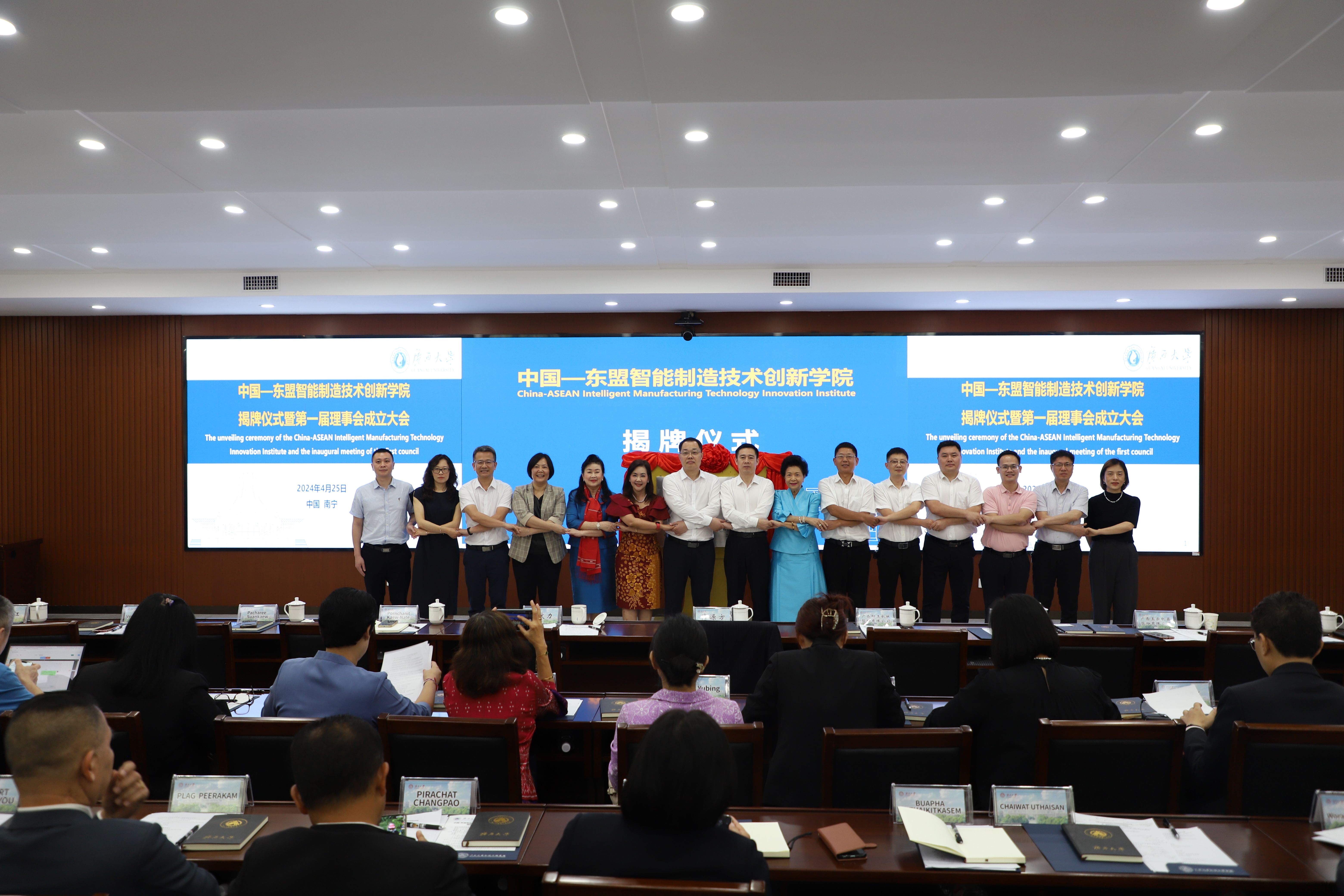 随后举行了中国-东盟智能制造技术创新学院第一届理事会会议。经过充分讨论,理事成员一致推选广西大学为理事长单位,柳工机械、玉柴机械、南宁学院、广西机电职业技术学院、广西交通职业技术学院为副理事长单位,北部湾大学、广西林业集团、广西机械工业研究院、南宁中车铝材精密加工公司、南宁职业技术学院、泰国川登喜大学、泰国朱拉隆功大学为理事单位。会议还通过了技术创新学院第一届理事会组织架构和主要负责人员名单,任命马献力为院长,卢婵江为常务副院长,侯国清、蔡宇平、陈正振、黄政艳、赵双良、贺德强为副院长,具体负责学院日常管理。理事会就技术创新学院2024-2026年工作计划达成共识。